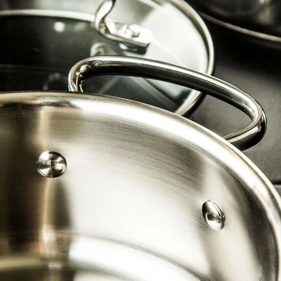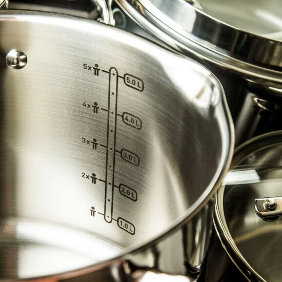 Set der Stahltöpfe und Kasserolle ist äußerst praktisch und eignet sich perfekt für die Zubereitung verschiedener Mahlzeiten. Die Produkte haben Schnäbel abzugießen und interne Litermaße. Die Töpfe können auf einem Gas-, Elektro-, Keramik- und Induktionsherd verwendet werden. Darüber hinaus können sie in der Spülmaschine gewaschen werden. Dank diesem Set wird das Kochen viel einfacher und angenehmer.