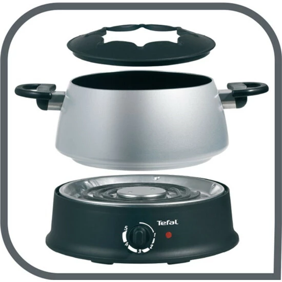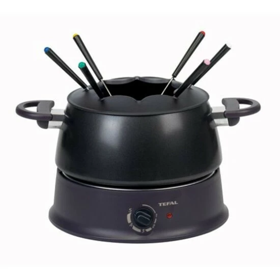 Dieser Fondue-Topf von Tefal besteht aus Aluminium und ist innen wie außen antihaftbeschichtet und darüber hinaus spülmaschinengeeignet. Er verfügt über wärmeisolierte Griffe und sechs wärmeisolierte Fondue-Gabeln. Der Spritzschutz mit Gabelhalter ist, beispielsweise für ein Käsefondue, abnehmbar. Das Sockelelement besteht aus Thermokunststoff und verfügt über eine Betriebsleuchte. Der Topf fasst bis zu 1,25 Liter.