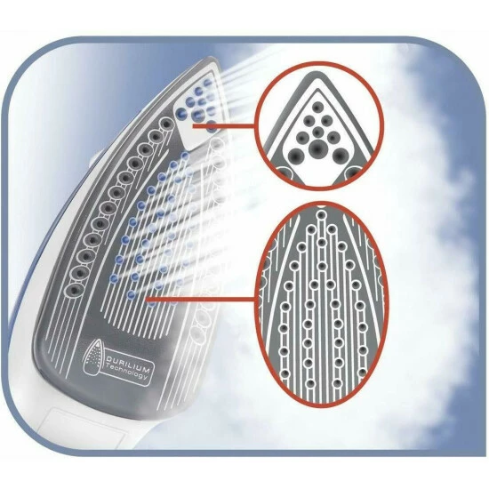 – Die automatische Dampfeinstellung, der praktische Dampfauslöser und die speziell entwickelte Präzisionsbügelspitze leisten zusätzliche Hilfe und beschleunigen das Bügeln. – Durilium AirGlide Bügelsohle mit drei Dampfzonen für hervorragende Gleitfähigkeit