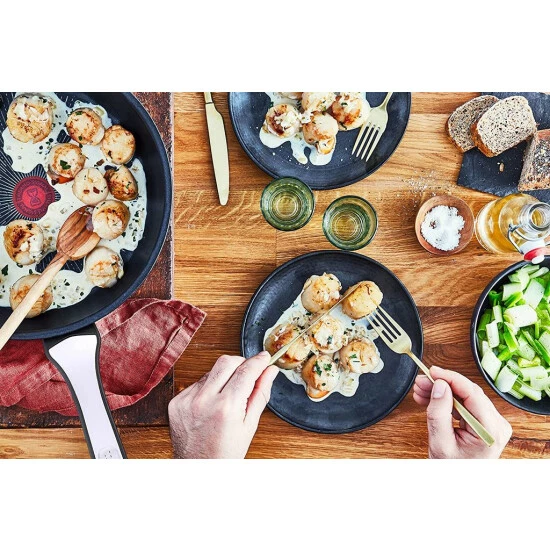Das unverwechselbare Brutzeln von Fleisch, das in die Pfanne kommt, das Klappern der Küchenhelfer, das schnelle Wenden mit dem Bratwender genau im richtigen Moment: Höchste Ansprüche an eine Pfanne, die extremen Bedingungen standhalten muss. Mit ihrer brandneuen TITANIUM ANTI-SCRATCH Beschichtung und einer herausragenden langlebigen Antihaftversiegelung, die selbst Küchenhelfern aus Metall standhält, und ihrem extrastarken THERMO-FUSION™+ Pfannenboden bringt die Pfanne Tefal Unlimited On ihr Kocherlebnis auf ein neues Level.