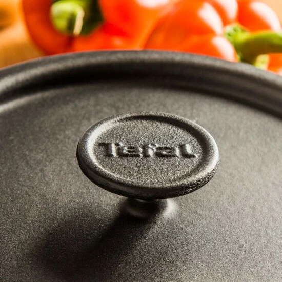 Der Deckel hat einen gusseisernen Griff mit einem Tefal-Markenlogo. Auf der Unterseite des Deckels befinden sich spezielle Laschen, die für die ordnungsgemäße Kondensation von Dampf während des Kochens verantwortlich sind.