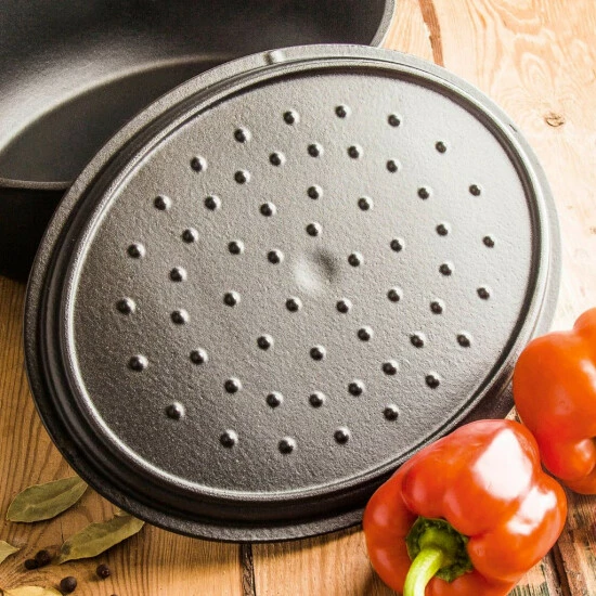 Der Bräter hat einen dicht schließenden Deckel, der aus dem gleichen Material herstellt wurde – Gusseisen.