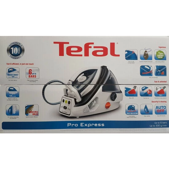 Pro Express liefert ausgezeichnete Bügelergebnisse auf Knopfdruck und vereint die volle Leistung der Hochdruck-Dampfbügelstation (300 g/Min. Dampfstoß) mit verbesserten Funktionen in einem einzigen außergewöhnlichen Produkt. Dank Tefals ausgereifter Boiler-Technologie (bis zu 6 bar) gibt diese benutzerfreundliche Hochdruck-Dampfbügelstation Ihrer Kleidung die Pflege, die sie verdient. Eine Vielzahl verbesserter Funktionen sorgt für müheloses Bügeln und herausragenden Komfort. Das Anti-Kalk-System mit unserem einzigartigen Anti-Kalk-Kollektor sorgt für dauerhafte Leistung ohne Mühe und eine Faltenglättung, die sich sehen lassen kann. Das Verriegelungssystem ermöglicht ein einfaches und sicheres Transportieren und Verstauen. Die Durilium AirGlide Autoclean-Bügelsohle besitzt herausragende Gleiteigenschaften, während die Abschaltautomatik für mehr Sicherheit beim Bügeln sorgt.