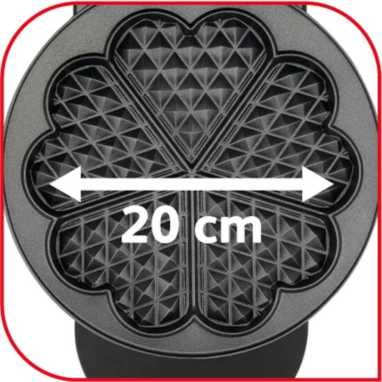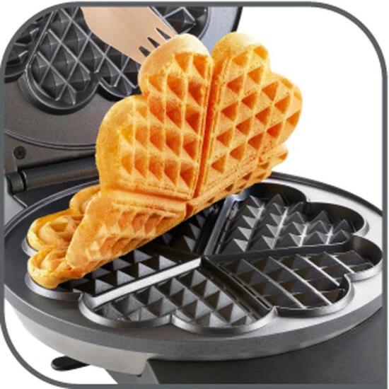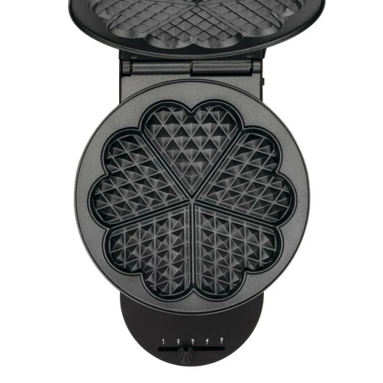 Waffeleisen für 5 köstliche Herzwaffeln. Individuell nach Ihrem Geschmack dank des stufenlos einstellbaren Temperaturreglers. Mit antihaftbeschichteten Waffelplatten, sodass Sie Ihre Waffeln ohne viel Öl und ohne Anbrennen zubereiten und leicht entnehmen können. Auch für eine schnelle Reinigung danach.