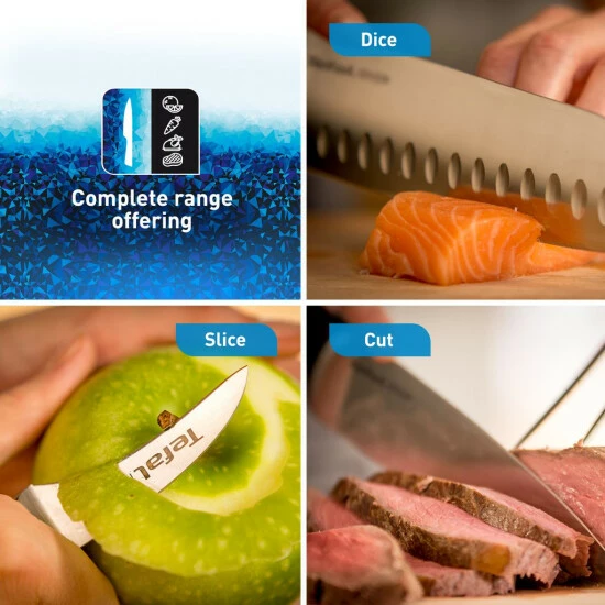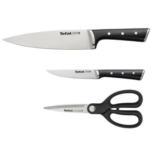 Erleben Sie optimale Schneidergebnisse mit den Ice Force Küchenmessern von Tefal. Als unverzichtbare Kollektion für jeden Schneidebedarf kombinieren diese grundlegenden Messer langanhaltende Leistung mit erstklassigem Design dank der Ice-Force-Technologie, einem kryogenen Verfahren, dass die Klingen bis auf -120 °C kühlt, um eine herausragende Schärfe und eine optimale Leistung zu erreichen. Aus deutschem Edelstahl, das Küchenmesserset Ice Force mit einem 20cm-Kochmesser für große Stücke, einem 11cm-Universalmesser zum Schneiden von kleinen bis mittelgroßen Obst- und Gemüsestücken und einer Küchenschere eignet sich ideal für den täglichen Bedarf in der Küche. Entdecken Sie die vollständige Reihe: – Schälmesser mit geschwungener Klinge 7 cm – Brotmesser 20 cm – Schälmesser 9 cm – Kochmesser 15 cm – Fleisch/Schinkenmesser 20 cm, – Santokumesser 18 cm