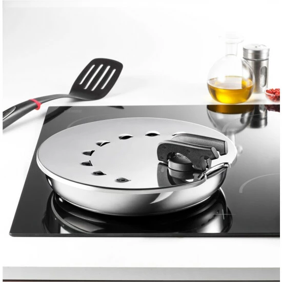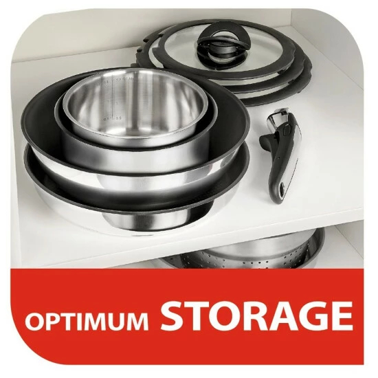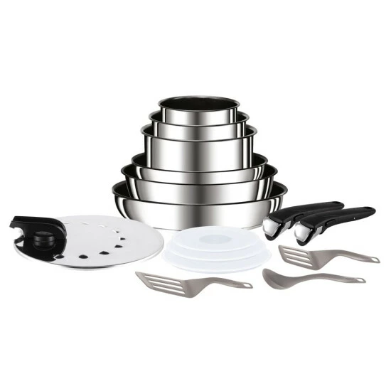 - Das 15-teilige Set ist umfangreich und besteht aus 2 Pfannen (22 und 26 cm), 3 Kasserollen (16, 18 und 20 cm), eine Schmorpfanne (24 cm), 1 Edelstahldeckel (für 20-26 cm), 3 Kunststoffdeckel (16, 18 und 20 cm), 2 abnehmbare Ingenio Griffe aus Thermokunststoff, 2 Bratwender und eine Schöpfkelle.