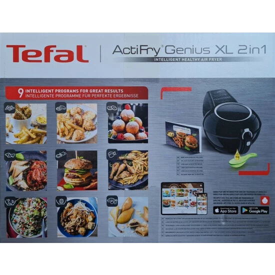 Tefal ActiFry Genius XL YV9708. Produkttyp: Heißluftfritteuse, Friteusenkapazität: 1,7 kg, Fettarme Frittier-Technologie: ActiFry. Bauart: Doppel, Produktfarbe: Schwarz, Steuerung: Berührung. Leistung: 1500 W