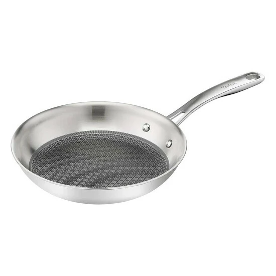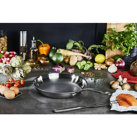 Entfalten Sie Ihr Kochtalent mit dieser Edelstahlpfanne, die köstliche Ergebnisse liefert, ohne anzuhaften! Die Eternal Mesh Bratpfanne von Tefal kombiniert die Eigenschaften von Edelstahl mit den Vorzügen einer Beschichtung: Freuen Sie sich über perfektes Anbraten und eine mühelose Reinigung. Die innovative, kratzfeste Mesh-Beschichtung ist in ein Edelstahlschutzgitter eingebettet: Genießen Sie hervorragende Ergebnisse, die weniger anhaften. Der dreischichtige Aufbau (Edelstahl / Aluminium / Edelstahl) sorgt für eine perfekte Hitzeverteilung: Freuen Sie sich über gleichmäßiges Garen und köstliche Ergebnisse.