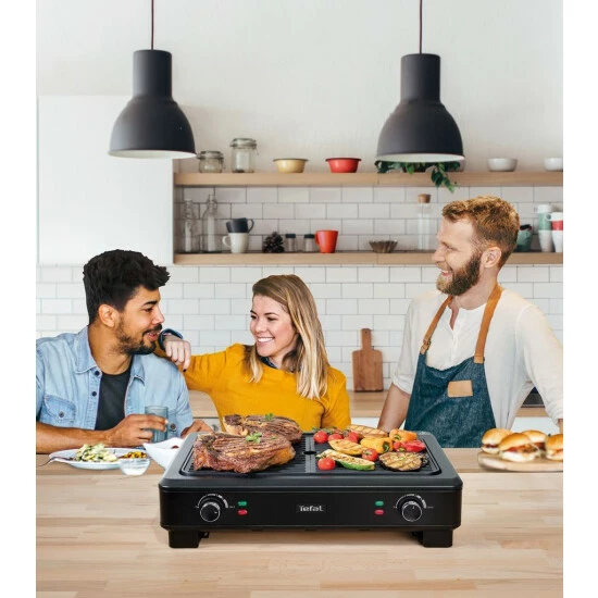 Mit dem Smoke Less Indoor Grill von Tefal können Sie das ganze Jahr lang köstliche Grillgerichte direkt in Ihrer Küche genießen. Die spezifische Smoke Shield Technologie sorgt für bis zu 70 % weniger Rauch und eine geringere Geruchsbildung* und gleichzeitig geschmacksintensive Grillergebnisse, wann immer Sie Lust darauf haben. Dank zwei leistungsstarker separater Grillzonen und eines einstellbaren Thermostats können Sie zudem gleichzeitig alles perfekt zubereiten: angefangen bei Fleisch über Fisch bis hin zu Gemüse – nutzen Sie die unzähligen Möglichkeiten! *Unabhängiger Test des TG80 Tefal Grills.