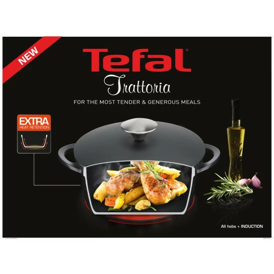 Mit dem Tefal TRATTORIA Schmortopf setzen Sie jeden Tag ein Maximum an Aromen in Ihrer Küche frei. Freuen Sie sich über köstlich zarte Speisen und perfekte Bratergebnisse. Erleben Sie den Unterschied, den Ihnen ein massiver Alugussboden mit außergewöhnlicher Wärmespeicherung bietet: gleichmäßige Brat- und Garergebnisse bei jeder Nutzung! Mit der Titanium Extra Antihaft-Beschichtung gelingt die Reinigung im Handumdrehen. Das robuste Design und die hochwertigen Materialien sorgen außerdem für langfristig hohe Leistungen, die keine Wünsche offen lassen. Leistung und Vielseitigkeit gehen Hand in Hand: Nutzen Sie Ihre Induktionspfanne im Ofen zum Schmoren bei Temperaturen bis 250°C und profitieren Sie von der Kompatibilität mit allen Herdarten einschließlich Induktion. Die inkludierten Griffschoner aus Silikon gerantieren einen sicheren Halt, auch wenn sich die Griffe mit dem Topf erwärmen. Die Tefal TRATTORIA Schmortöpfe: herausragendes Kochgeschirr für perfekte Ergebnisse jeden Tag.