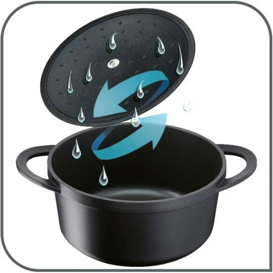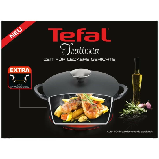 Der Tefal Trattoria Kochtopf ist auf maximale Geschmacksentfaltung ausgerichtet und überzeugt mit einer verbesserten Wärmespeicherung für gleichmäßiges Garen und zarte, geschmackvolle Gerichte. Erleben Sie den Unterschied mit der Titanium Extra Antihaft-Beschichtung, die sich mühelos reinigen lässt. Das robuste, langlebige Design mit starkem Aluguss-Boden sorgt dafür, dass all Ihre Lieblingsgerichte perfekt gelingen. Hervorragende Wärmespeicherung: Aluguss-Form und kompakter Boden ermöglichen mühelose Zubereitungen Umweltfreundlich: Recycelbares Produkt mit sicherer Antihaftversiegelung (Blei und Cadmium) Herdarten Geeignet für alle Herdarten (Gas, Elektro, Keramik) inklusive Induktion. Hohe Wärmespeicherung Elegante Aluguss-Konstruktion mit dickem Boden sorgt für besonders gute Wärmespeicherung, ideal für zarte, köstliche Gerichte. Kondensationssystem Die homogene Kondensationsverteilung erleichtert es, anspruchsvolle Rezepte und Zutaten zu verarbeiten. Reinigung Tita