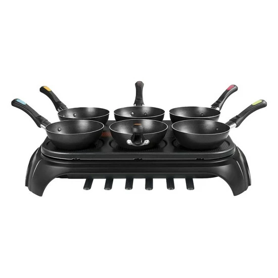 In den Wokpfannen können Sie herrliche Dinge zubereiten und auf der Platte selbst ist Platz für sechs kleine Pfannen. Der Thermospot zeigt an, wann Sie anfangen können. > 1x Tefal PY5828 WOK GOURMET PARTY > 6x Wok-Pfanne > 1x Kelle > 6x Spatel > 1x Rezeptbuch Highlights: > 1000 Watt Leistung > Thermo Spot > Antihaftbeschichtung